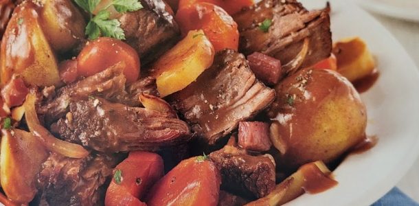 - Verser la préparation au vin rouge sur le rôti de palette. Ajouter l’oignon, les pommes de terre et les carottes. Remuer.