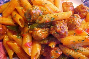 - Ajouter les penne, mélanger, ajouter la louche d’eau de cuisson et mélanger, laisser cuire quelques minutes pour que la sauce imbibe bien les penne et que les saveurs se marient.