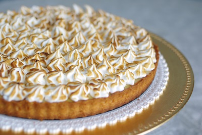 - Glissez la tarte 2 ou 3 minutes sous le gril, jusqu’à ce qu’elle prenne une belle coloration. ( j’ai réalisé le décor avec une poche à douille et une douille dentelé, et j’ai plutôt utilisé un chalumeau de cuisine pour griller légèrement la meringue, j’ai laissé bien prendre dans le moule au frais, sans la démouler ).