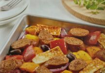 Plaque de saucisses et halloumi à la grecque (Préparez, congelez… et dégustez)
