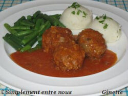 • Faire chauffer la soupe aux tomates et l’eau, ajouter le sucre, le basilic, sel et poivre au goût et verser la soupe sur les boulettes.