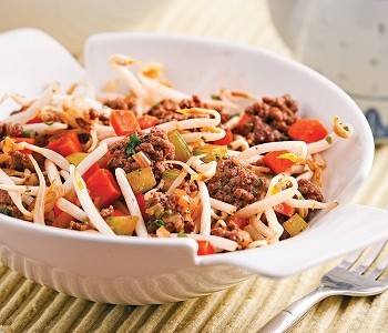 1. Dans une poêle, chauffer l’huile à feu moyen. Cuire le boeuf haché 5 minutes.