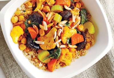 - Au moment de servir, répartir le couscous dans six assiettes. Garnir chaque portion de la préparation de légumes et parsemer des amandes.