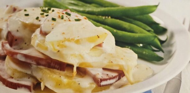 4. Répartir le tiers des tranches de pommes de terre dans la mijoteuse. Couvrir du tiers du jambon et du tiers de la sauce béchamel. Répéter ces étapes deux fois de façon à former trois étages. Couvrir du reste du fromage.