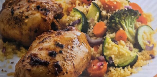 Préchauffer le four à 205 C (400 F). Dans un bol, mélanger 2 courgettes coupées en demi-rondelles avec 2 carottes coupées en fines rondelles, 1 brocoli coupé en petits bouquets, 1/2 petit oignon rouge haché, 15 ml (1 c. à soupe) d’ail haché et 15 ml (1 c. à soupe) d’huile d’olive. Saler et poivrer. Étaler la préparation sur une plaque de cuisson tapissée de papier parchemin. Cuire au four de 12 à 15 minutes, en remuant à mi-cuisson. Pendant ce temps, porter 375 ml (1 1/2 tasse) de couscous avec 15 ml (1 c. à soupe) d’huile d’olive. Verser le bouillon bouillant sur le couscous. Couvrir et laisser reposer 5 minutes avant d’égrainer le couscous à l’aide d’une fourchette. Ajouter les légumes rôtis dans le bol contenant le couscous et remuer délicatement.