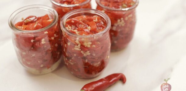 Pour la saveur j’aurais préféré de l’huile d’olive mais comme on doit conserver ces piments au réfrigérateur, celle-ci fige ce qui rend l’usage des piments un peu compliqué. Je vous suggère donc de l’huile de pépins de raisin ou une huile qui ne fige pas au froid.