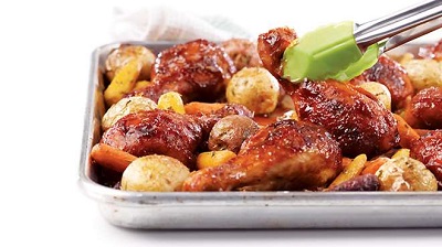 - Cuire au four environ 60 minutes ou jusqu’à ce que le poulet se détache facilement de l’os et que les pommes de terre et les carottes soient bien tendres.