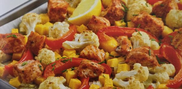 - Sur une plaque de cuisson tapissée de papier parchemin, étaler la préparation aux légumes et le saumon. Cuire au four de 25 à 30 minutes, en remuant à mi-cuisson.